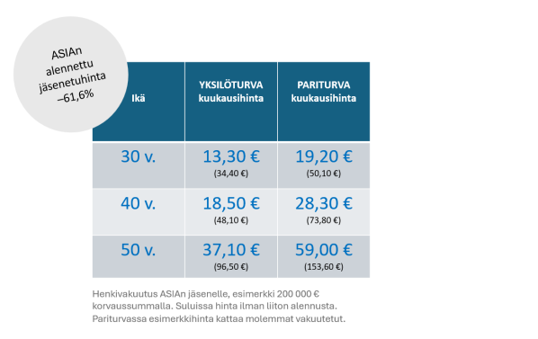ASIAn jäsenenä sinä ja puolisosi olette oikeutettuja pysyvästi edulliseen henkivakuutukseen Kalevasta. Jäsenetuna saat 61,6 % alennuksen, mikä tarkoittaa keskimäärin 733 euron säästöä vuosittain. Pariturvassa riittää, että toinen on liiton jäsen.