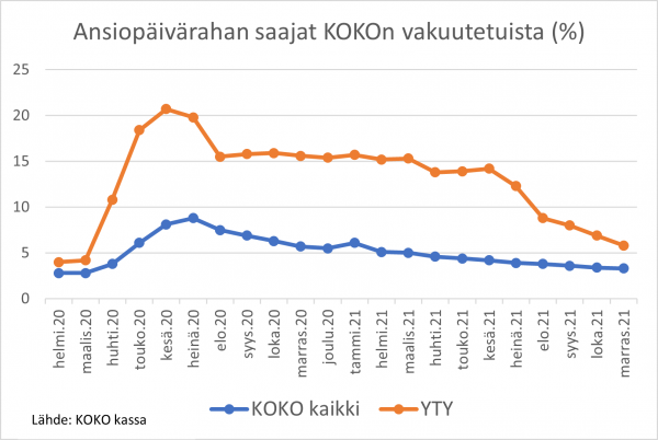 KOKO-kassan tilastojen mukaan 5,8 prosenttia YTYn vakuutetuista oli lomautettuina marraskuussa 2021. Tätä voi verrata maaliskuuhun 2020, jolloin lomautettuja oli 4,2 prosenttia.