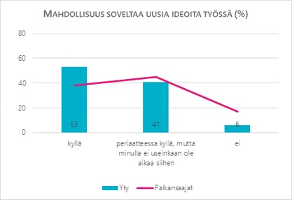 Yhteensattumia -kyselyn vastaajista hieman yli puolet (53 %) arvioi, että heillä on mahdollisuus soveltaa uusia ideoita työssään. Jonkin verran harvempi (41 %) katsoi, että uusia ideoita on periaatteessa mahdollista soveltaa, mutta todellisuudessa siihen ei ole aikaa. YTYn jäsenillä ideoiden soveltamismahdollisuudet olivat jossain määrin paremmat kuin palkansaajilla keskimäärin (38 %).
