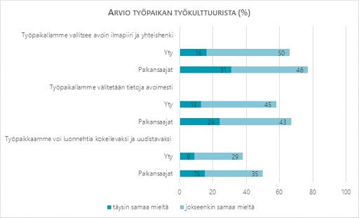 Kyselyn vastaajista 66 % arvioi työpaikkansa ilmapiirin avoimeksi ja 58 % katsoi, että tietoja työpaikalla välitetään avoimesti. Kuitenkin vain 38 % piti omaa työpaikkaansa kokeilevana ja uudistavana. Vastaava osuus oli palkansaajilla 50 %. YTYn jäsenten työpaikkojen työkulttuurissa olisi kehittämisen varaa kohti kokeilevampaa ja uudistavampaa kulttuuria.