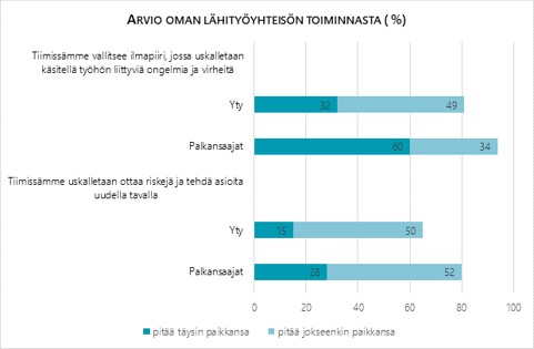 Kyselyn vastaajista 81 % arvioi, että omassa tiimissä vallitsee ilmapiiri, jossa uskalletaan käsitellä työhön liittyviä ongelmia ja virheitä. Vastaavasti 65 % katsoi, että tiimissä uskalletaan ottaa riskejä ja tehdä asioita uudella tavalla. Vaikka valtaosa YTYn jäsenistä koki näin työpaikkansa psykologisesti turvalliseksi, on osuudet matalammalla tasolla kuin palkansaajilla keskimäärin.