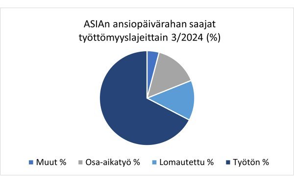 ASIAn ansiopäivärahan saajista 67 prosenttia oli työttömiä ja 14 prosenttia kokoaikaisesti lomautettuina. Vuosi sitten lomautettujen osuus oli hieman alhaisempi eli 11 prosenttia.