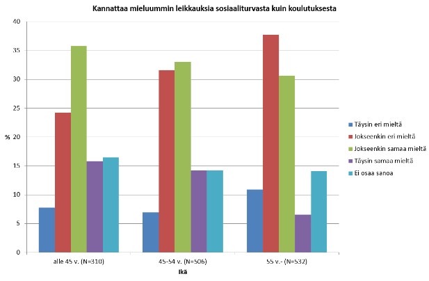 Selkeimmät näkemyserot eri ikäryhmien välillä liittyivät mahdollisiin leikkauskohteisiin. Koko jäsenistön vastauksissa kysymykseen, kannattaako mieluummin leikkauksia sosiaaliturvasta vai koulutuksesta, puntit menivät tasan. Kun vastauksia tarkasteltiin ikäryhmittäin, huomattiin että alle 45-vuotiaat näkevät mieluummin sosiaaliturvaleikkauksia (57 %) kuin koulutusleikkauksia (32 %). Samalla yli 55-vuotiaat vastaajat päinvastaisesti vastustavat sosiaaliturvaleikkauksia (48 %) koulutusleikkausten kustannuksella (38 %).